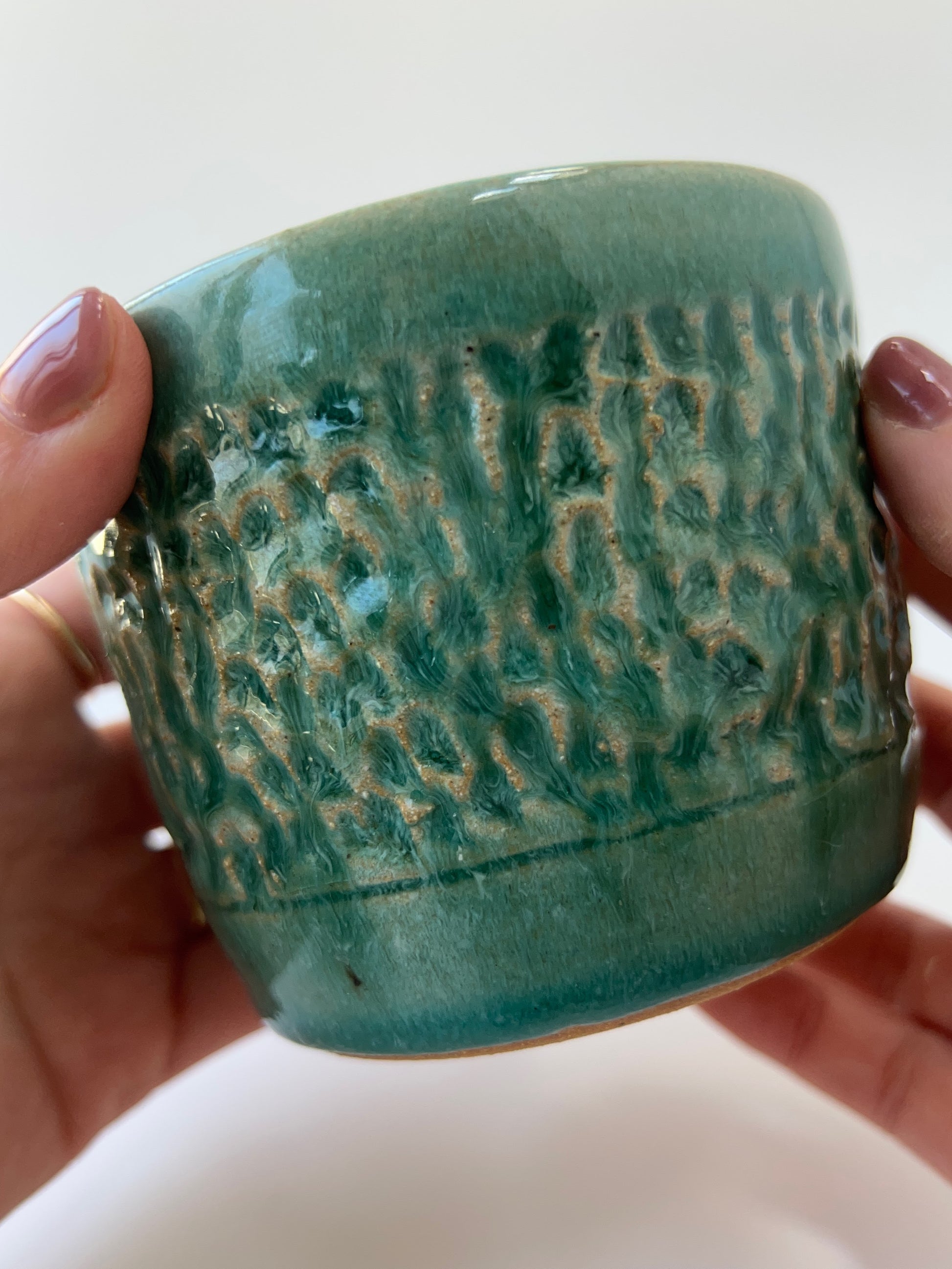 - Handmade, wheel thrown cup/handleless mug with carved details