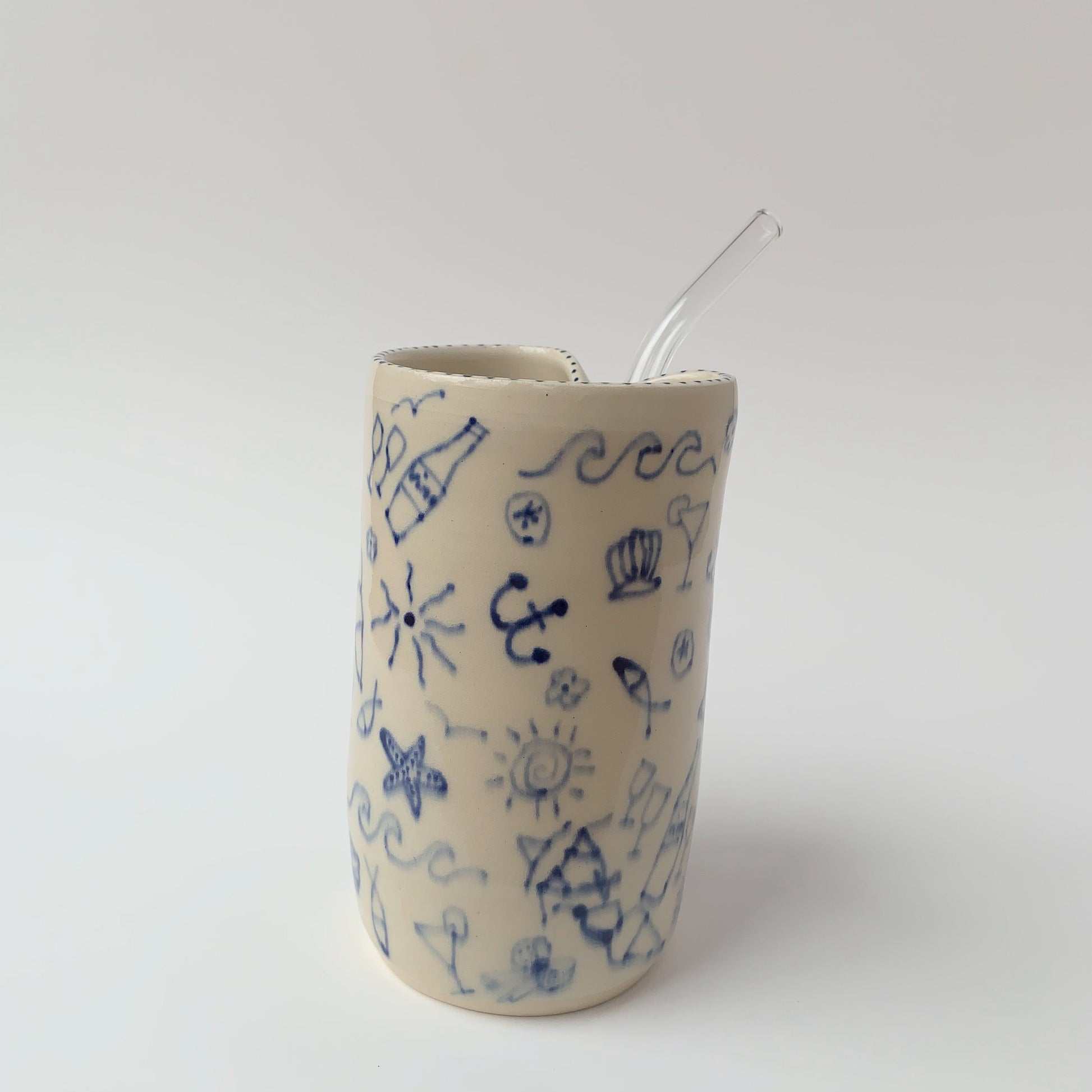 Effortlessly enjoy your favorite beverages at home or on-the-go in this tumbler! Hand painted nautical doodles around the entire tumbler.